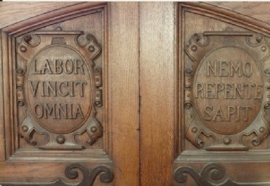 In the Governors’ minute book under the date May 19th, 1881 the working party, remembering the School’s chief benefactors, advise the mottoes of the City and University Fortis est veritas and Dominus illuminatio mea be placed on the tablets facing George Street’. In a letter from his office in the Temple dated the same day and read at the meeting on May 25th the Architect wrote ‘the Contractor will shortly require to move his scaffold… May I therefore suggest as the second motto which appears appropriate to the building? If the Governing Body approve, I should be glad to have this cut at once. I hope to send Alderman Hughes a drawing and an estimate for the clock face shortly.’ Resolved… the question of the motto had already been settled. Perhaps we are left wondering which the other motto was. But Jackson’s enthusiasm was not easily turned aside and before the School opened on September 15th, 1881 there 48 were carved on the panels of the front door, plain for all to see, Labor vincit omnia and Nemo repente sapit (see the illustration in the Magazine for July 1965).